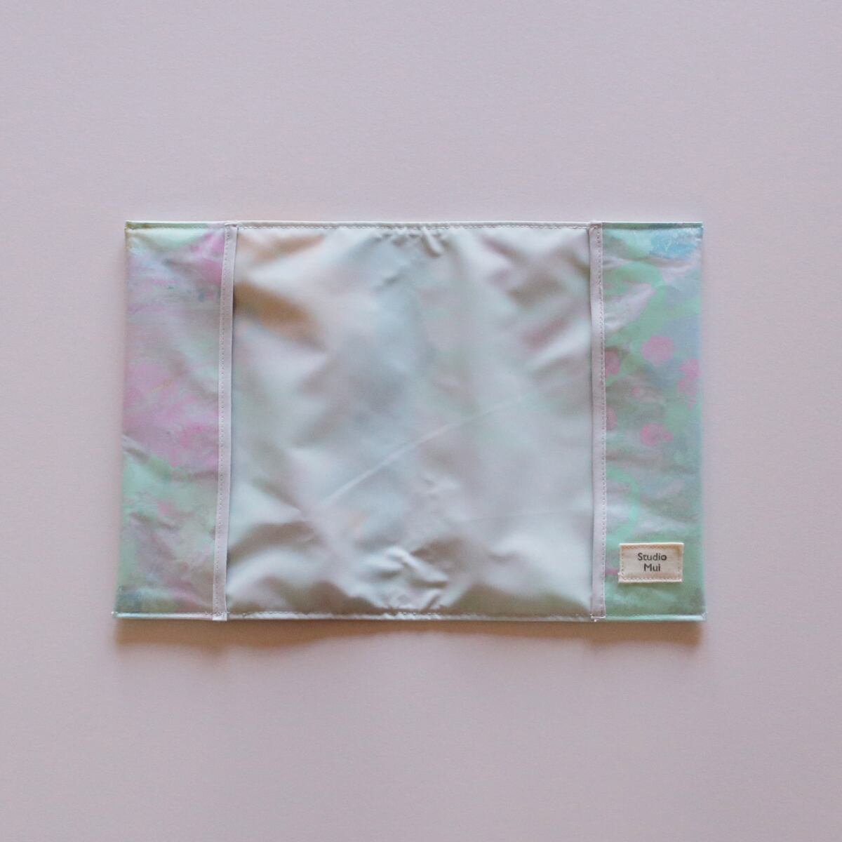手作業でペイントした布の上に、マットなビニール素材を重ねて仕立てています。